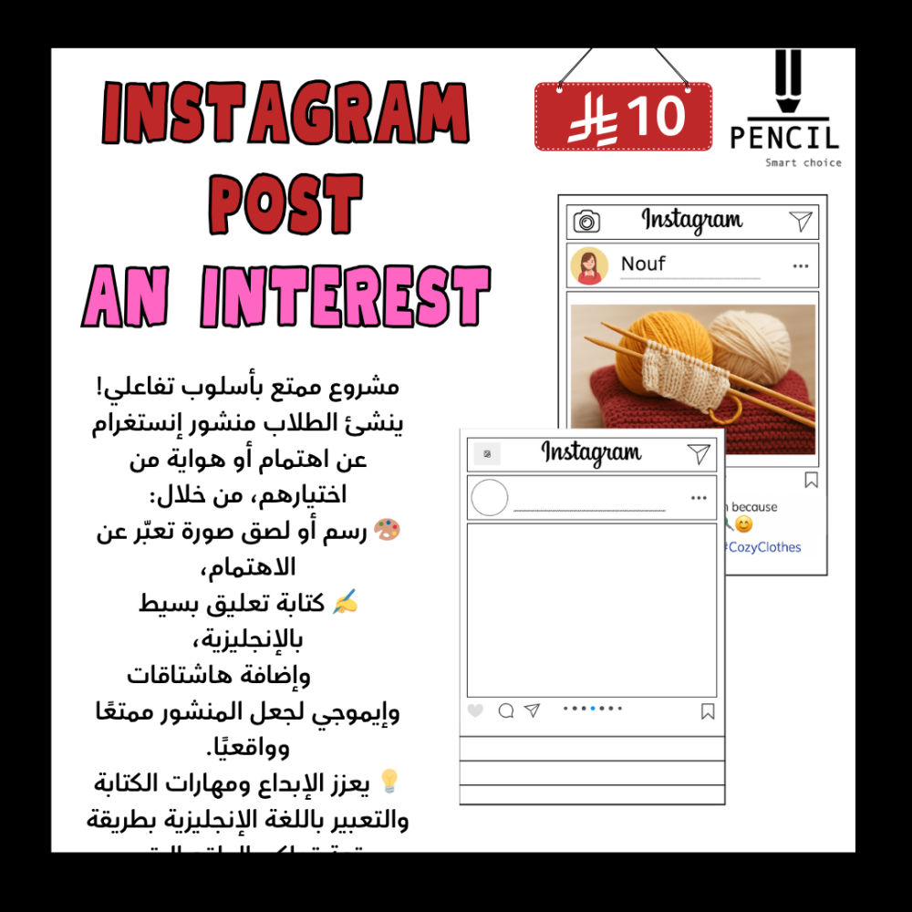 يُنشئ الطلاب منشورًا عن اهتمام أو هواية من اختيارهم، مع صورة وتعليق وهاشتاقات ممتعة.